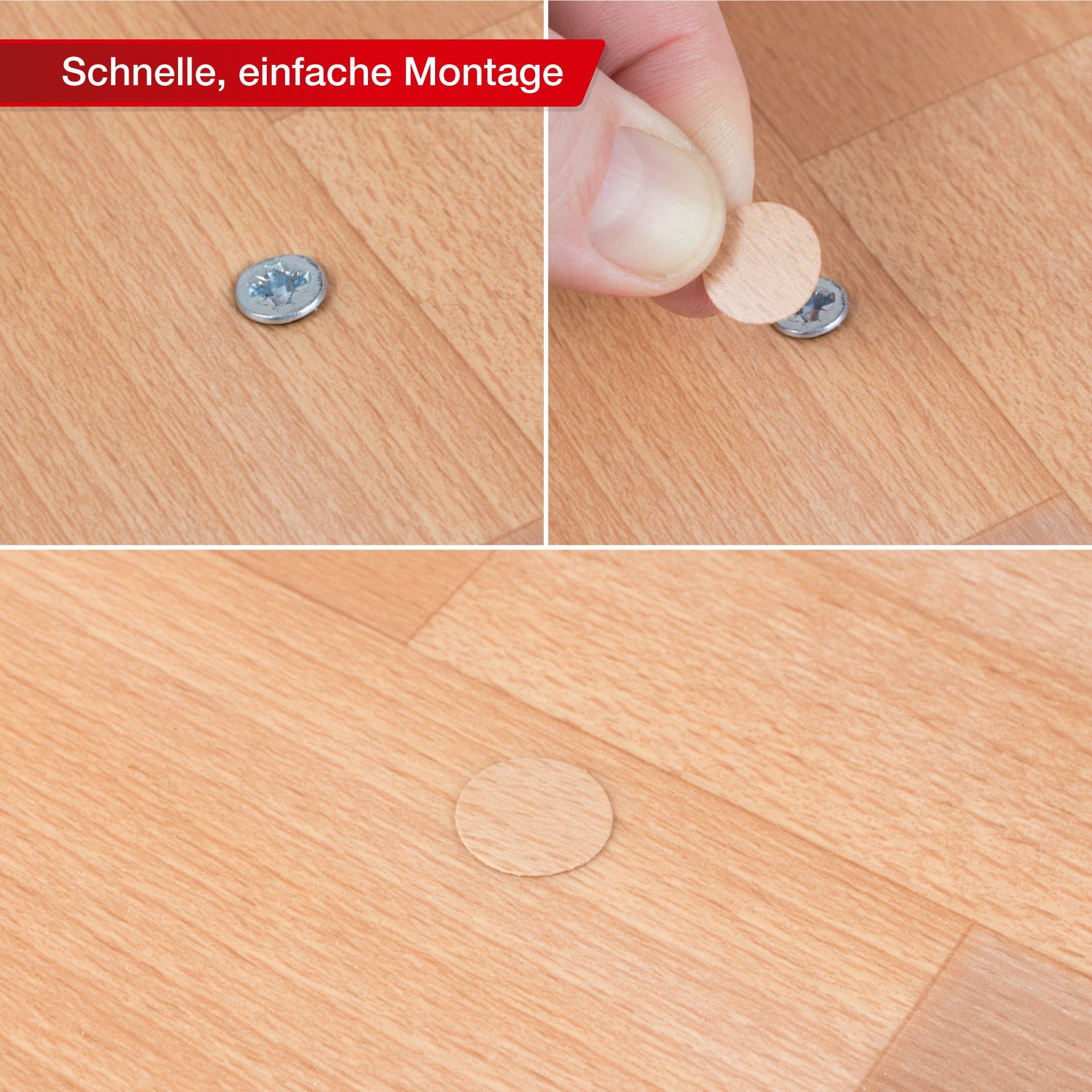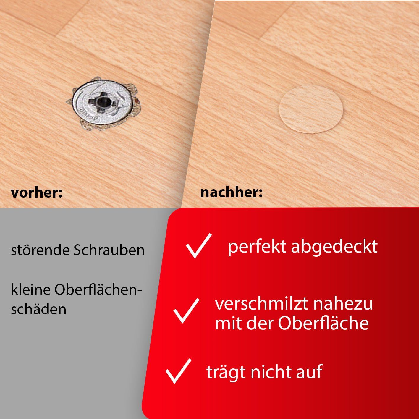 Mit diesen Schrauben Abdeckkappen lassen sich Schraubenköpfe, Bohrlöcher und kleine Oberflächenschäden ganz leicht verbergen. Die Möbelpflaster sind unauffällig, tragen nicht auf und verschmelzen nahezu übergangslos mit dem Möbelstück.